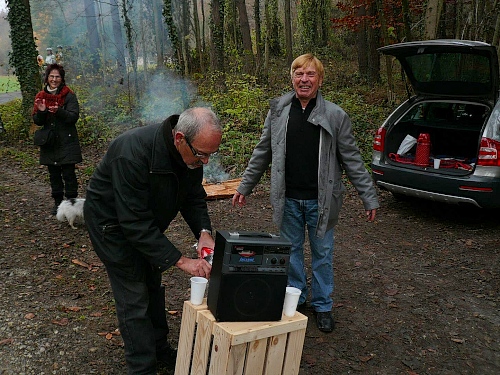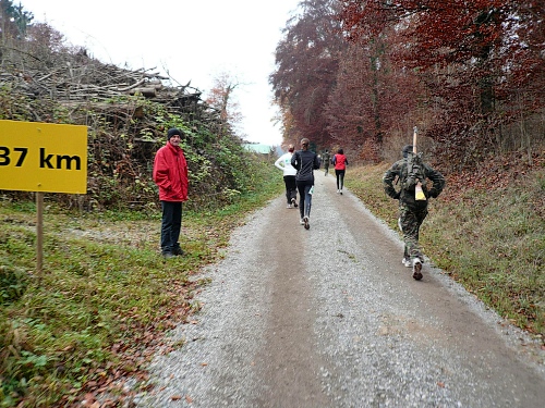 Nur mit ausgeschaltetem Hirn ist der Abschnitt zwischen Kilometer 36 und 38 zu bewältigen. Denn da warten noch zwei üble Steigungen. In einem Waldstück haben zwei eine private Tankstelle aufgebaut. Mit Volksmusik und Lagerfeuer hat man es sich bequem gemacht und reicht den Vorbeilaufenden eine Labe hin.