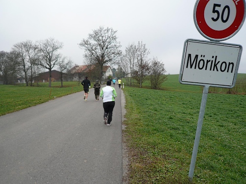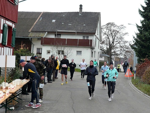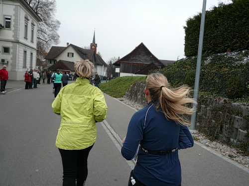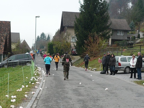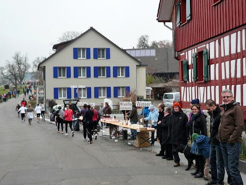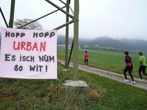 An einem Strommast hängt ein Motivator für Urban: „Es isch nüm so wit“, lese ich. Es ist nicht mehr weit, nur noch rund elf Kilometer. Die Häufigkeit der V-Stellen (sieben auf der zweiten Hälfte!) macht das Survival-Training auf der Marathonstrecke einfacher. Vor Stettfurt wartet noch mal eine Steigung auf einem Feldweg und anschließend im Ort. Früher wurde da an einem Feuerwehrhaus neben Aqua in purer Form auch Schnapswasser und Feuerwasser ausgeschenkt.