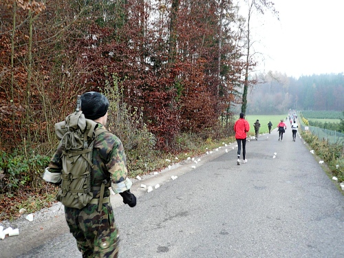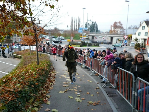 Kurz danach geht es lange bergan und dann biegen wir nach rechts auf die uns bekannte Strecke ein. Wieder ein Stimmungsnest von Zuschauern. Dann warten die Kamelbuckel. Einmal das Gefälle hinunter und dann hoch. Den Schwung müsste man mitnehmen können. Die Waffenläufer kämpfen, einige pfeifen aus dem letzten Loch. Ein anderer neben mir lässt einen fahren und nimmt den Turboschwung seines Nachbrenners gleich mit. Ja, mit Vollgas zum Endspurt ist auch eine Taktik auf den letzten vier Kilometern.