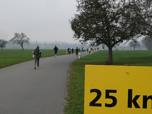 Nach 2.07 Stunden Laufzeit habe ich bereits 25 Kilometer hinter mir und bin schon fleißig am Überholen der Junioren und Frauen. Auffallend ist beim Frauenfelder die hohe Frauenquote beim Halben. Es sind über 25 Prozent. Auf der zweiten Hälfte hat die Stimmung unter den Zuschauern deutlich zugenommen. Fast an jeder Ecke stehen welche. Und was mich erstaunt: Es gibt einige Plätze in der freien Natur, wo sich ganze Hundertschaften versammelt haben. Die Fahrzeuge stehen derweil in den Wiesen oder an den Straßen aufgereiht. Das Messen mit den Waffenläufern und Halbmarathonis macht nicht nur mir Spaß und Freude.
