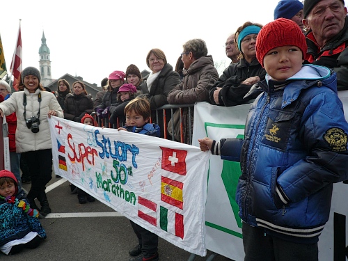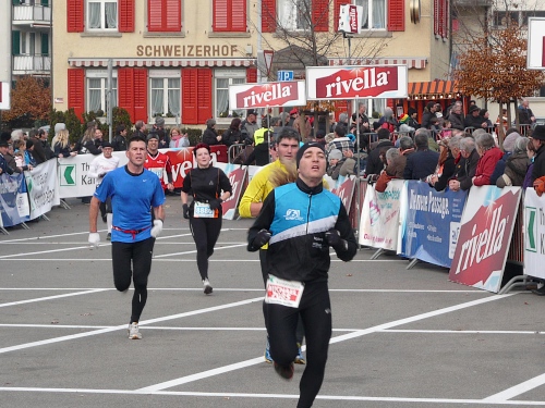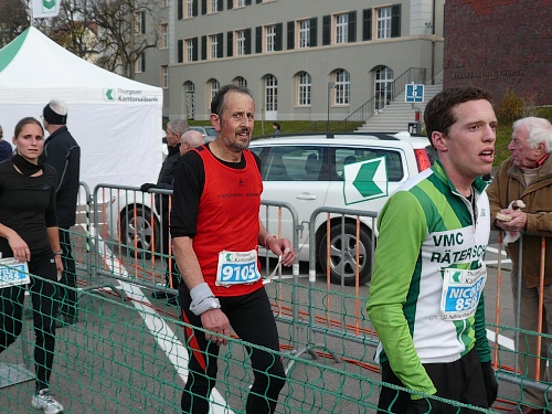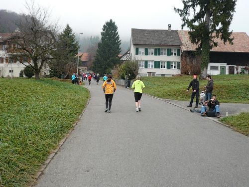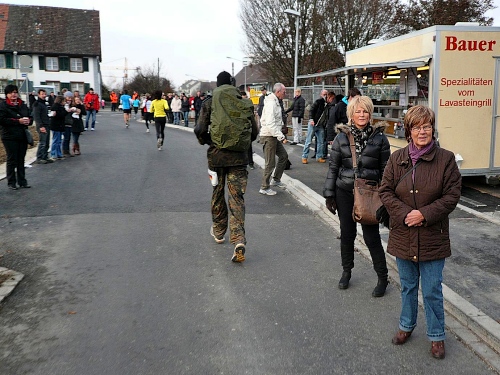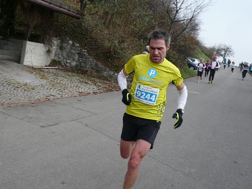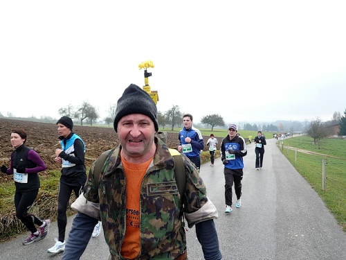 Wo bleibt denn die Spitze des Männerfeldes im Halbmarathon, frage ich mich mehrmals und rechne dann nach. Ich bin schneller unterwegs als 2010. Doch dann kommt der Führende Bruno Heuberger, der schon einen Vorsprung zu den Verfolgern hat. Aber da gibt es noch ein Gerangel um den Sieg, denn Bruno wird im Ziel als Zweiter erscheinen.