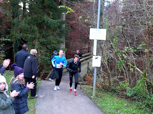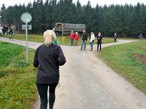 Es geht nun nicht direkt zum Ziel, sondern wir biegen in ein Waldstück ein, es fehlen ja noch etwa zwei Kilometer. Es geht fast nur noch flach dahin. Auf einer Holzbrücke verlassen wir den Wald. Die Halbmarathonis haben ihr Tempo nun merklich angezogen.