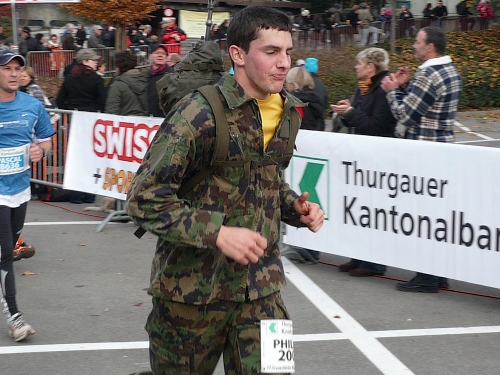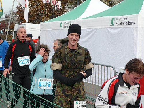 Kilometer 38, am Ende der Steigung warten nochmals die Samariter und reichen Getränke zu. Auf mein „Freibier“ höre ich nur „im Ziel“. Am Stadtrand Frauenfeld finden sich abermals viele Anwohner. Von einer Grillstation riecht es nach Schweinernem, mir knurrt sogleich der Magen.