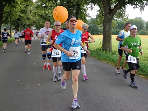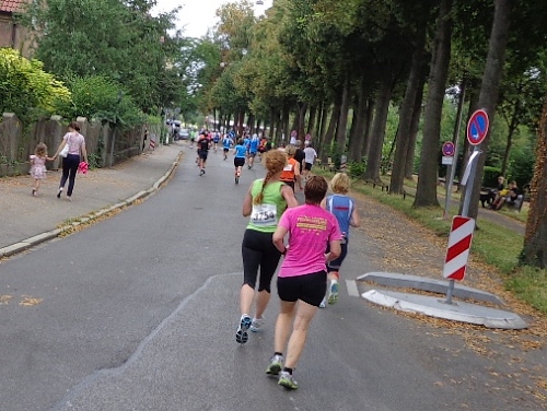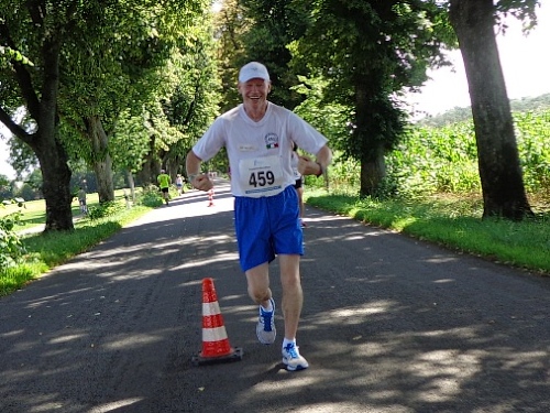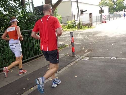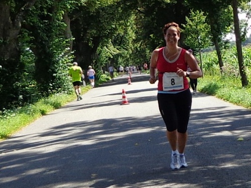 Km3 nach 18min; Weiter stadtauswärts, das Feld zieht sich auseinander. Rechts den Klausenberg runter laufen wir im Schatten von Bäumen. Bei km5 gibt es zu trinken, ich fühle mich endlich etwas besser, Miss Sporty feuert uns an.