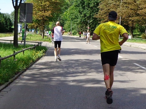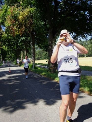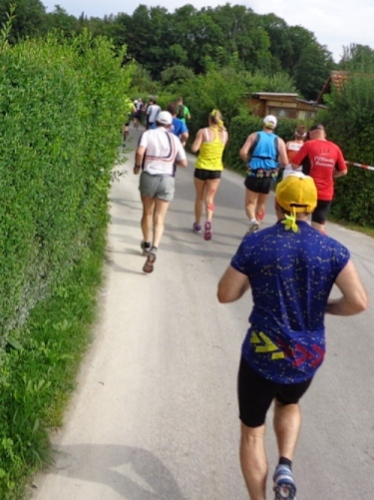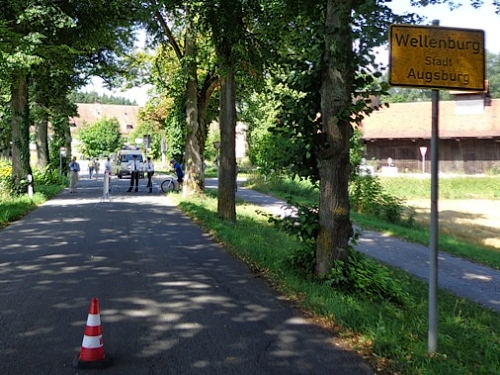 Km6 nach 35min; Bald danach laufen wir über den Lech. Hier herrscht wieder Gegenverkehr und man sieht seine Mitstreiter, die ein paar min Vorsprung haben, das ist kurzweilig. Es führt eine 2km lange Baumallee nach Wellenburg, aber schon bald (bei km7) ein U-turn und im Nu sind wir bei der nächsten Tränke. Nur ja keine auslassen heute. Mittlerweile scheint die Sonne und ich bin froh, als es für ein paar Minuten in den Wald geht. Sanitäter warten auf Ihren Einsatz. An Schrebergärten vorbei erreichen wir eine Schnellstraße, an der wir etwas entlang laufen.