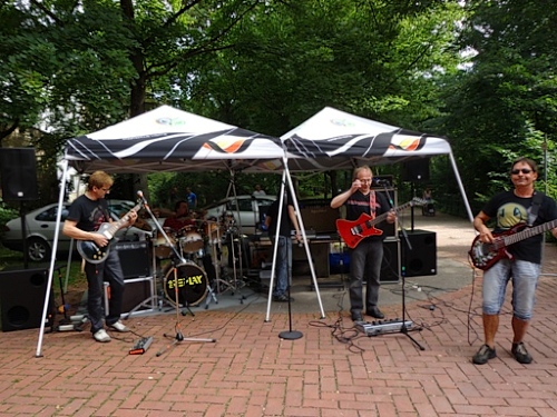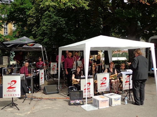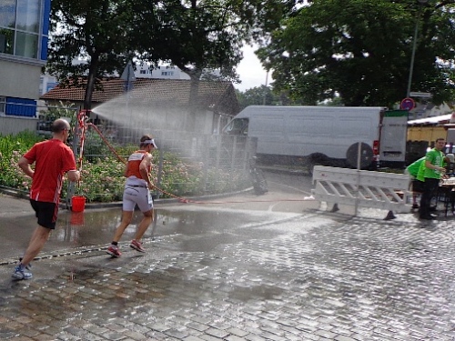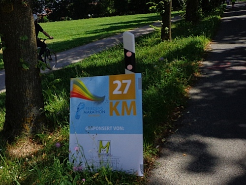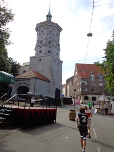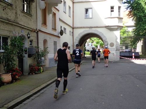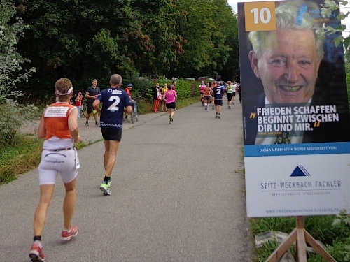 Bei km13 Live-Musik, der Meilenstein zeigt Mihail Gorbatschow: „An den Frieden denken heißt, an die Kinder denken“. An der nächsten Labe kann geduscht werden, denn längst hat sich die Sonne durchgesetzt! Momentan komme ich mit Wasser und Iso aus. Die Schwimmstraße mit Kopfsteinpflaster rauf, ich muss auf jeden Schritt achten. Rein in die Stadt. Eine kleine Big-Band sorgt für Unterhaltung. Ein leichter Anstieg zum Wertachbrucker Tor. Das „Wertachbrucker Thor Fest“ hat vor zwei Tagen begonnen, ist heute aber noch nicht in Schwung gekommen. Die Buden sind noch verwaist, die Bäume spenden Schatten. Die nächste Labe bietet wieder Wasser, Iso und Bananen und viele eifrige Helfer. Jede(r) bietet zwei Becher an. Ein Stück weiter beim Start des AOK-5km-Laufes gibt es einen motivierenden Platzsprecher. Ich bin in der Innenstadt angekommen.