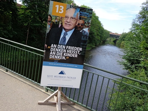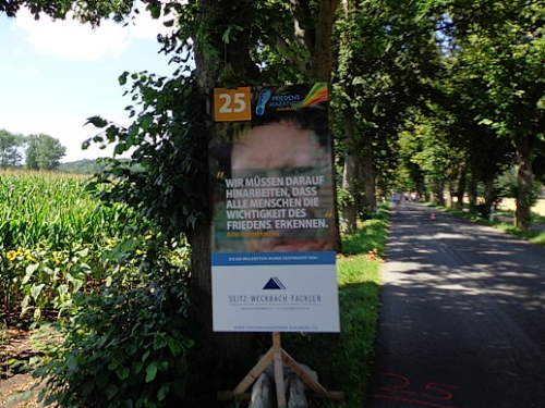 Km10 nach 59min; Der Meilenstein Km10 zitiert Helmut Hartmann: „Frieden schaffen beginnt zwischen dir und mir.“ Helmut Hartmann ist Unternehmer, er stiftete u.a. den Augsburger Wissenschaftspreis und wurde 2003 mit dem Augsburger Friedenspreis ausgezeichnet.