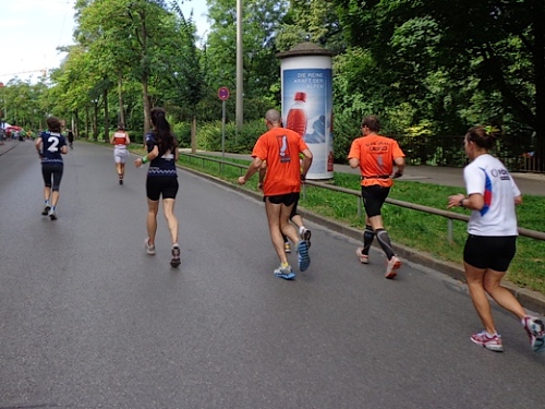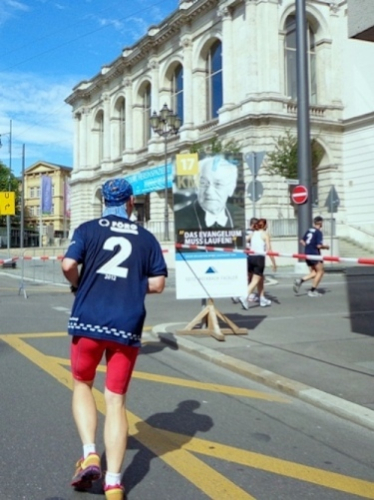 Als wir in der Nähe des Hauptbahnhofs die Schienen überqueren, fährt unter uns eine rauchende und dampfende Dampflok durch, hier wird einem was geboten! Bei km2 die erste 180°-Wende, nun laufen wir stadtauswärts. Reges Zuschauerinteresse vor den Hotels. Wieder über die Schienen sehe ich eine lange Läuferkolonne vor mir. Noch bin ich nicht in Form, ich hoffe, das kommt bald. Zögerlich kommt die Sonne durch. Es könnte warm werden. Kein Wunder, es ist Hochsommer.