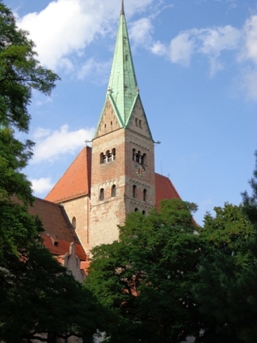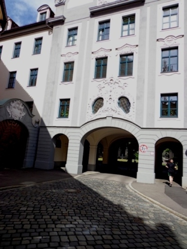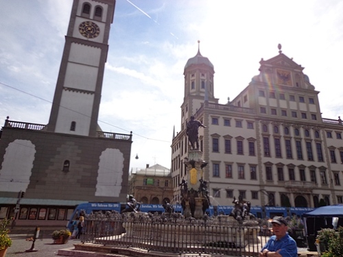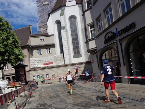 Km15 nach 1h29min; es läuft. An einer Hauswand entlang, dann links abgebogen, durch das Tor „Regierung von Schwaben“ in den Fronhof bin ich plötzlich in einem kleinen Park, mit Wiesen und Blumen und bald am über 1000-jährigen Dom. Den haben Gert und ich gestern auch besichtigt. Ein paar Applaudierende im Halbschatten feuern mich an. Haken schlagend durch die Innenstadt, über den Rathausplatz vorbei und durch Baustellen. Die Fuzo ist hier notdürftig geflickt, gut genug zum Shopping, zum Laufen nicht so bärig. Durch die vielen Richtungswechsel ändert sich ständig das gefühlte Wetter. Eben noch in der prallen Sonne, hat man nach der nächsten Abzweigung Schatten und kühlenden Wind. Immer wieder sieht man andere Läufer, die entweder gerade vor einem sind oder ein paar min zurück. Dieser Überblick über das Starterfeld gefällt mir immer mehr. Beim Stadttheater ist km17 und es ist Zeit für mein EnergieGel.