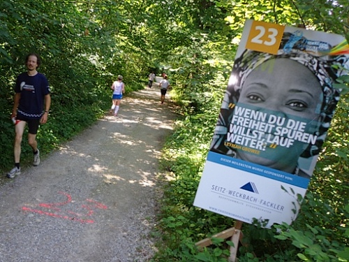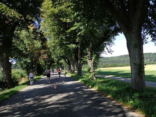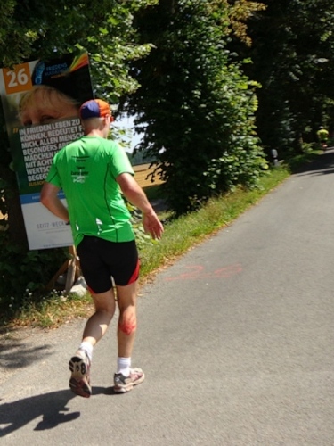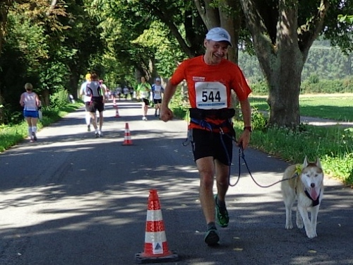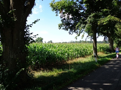 Auf einer Schotterbank im Fluss Badegäste. Ist ja auch ideales Badewetter. Der Weg führt uns wieder zur langen Geraden nach Wellenburg. Vor lauter Bäumen sieht man gar nicht, wo die endet. Links ein Maisfeld, rechts teilweise abgeerntete Weizenfelder. Jene, die mir am Beginn der Geraden entgegen kommen, sind 4km vor mir, wie Wolfgang und Michael etwa. Aber das weiß ich zu dem Zeitpunkt noch nicht. Ich passiere die Wendemarke aus der ersten Runde, diesmal geht es geradeaus weiter. Wie weit, ist noch nicht zu sehen. Da kommt mir der Husky mit seinem Herrl entgegen. Dass ein Schlittenhund auch bei Hitze so gut laufen kann, habe ich nicht gewusst. Wieder was gelernt. Hier sind wir aber fast nur im Schatten, ich will gar nicht mehr weg von hier.