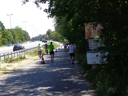 Wenn man nun am Gehweg läuft, hat man Asphalt statt Straßenpflaster und - viel wichtiger - Schatten. Man tut was man kann. Ein Streckenposten mahnt uns, auf unseren Kreislauf zu achten und nicht zu schnell zu laufen. Keine Angst, heute nicht.