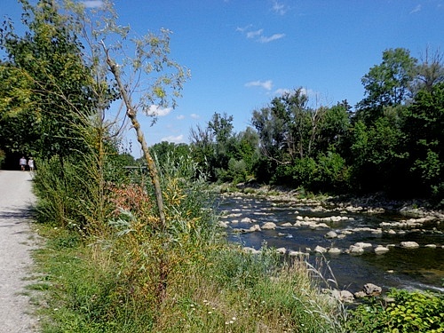 In der Sonne laufen, damit man bald wieder in den Schatten kommt. Im Schatten gehen, dann hat man länger etwas davon. So mache ich das. Unter der Schnellstraße durch am Kiesweg wieder stadteinwärts, am Fluss entlang.