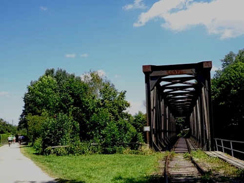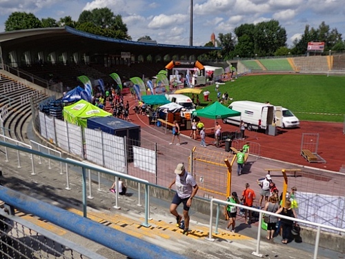Km 39; Die kleine Big-Band ist mittlerweile spurlos verschwunden. Franz aus Wels kommt mir entgegen, im Gespräch mit einem motorisierten Streckenposten. Franz wird die AK-70 gewinnen. Mir geht es immer besser. Ich laufe am Schwimmbad vorbei und entlang der Eisenbahn bergauf, schließlich unten durch und bei Km40 nach 4h17min wieder bergab. Nun geht es auf einer Art Landzunge Richtung Rosenaustadion. Rechts der Fluss, links ein Kraftwerks-Kanal bis wir den dann überqueren. Der Gehweg ist im Schatten, also nehme ich den. Ein Radfahrer kommt vorbei und fordert uns auf, gegebenenfalls bis ins Ziel zu gehen, noch 600m.