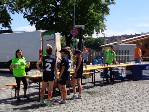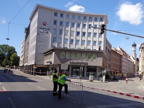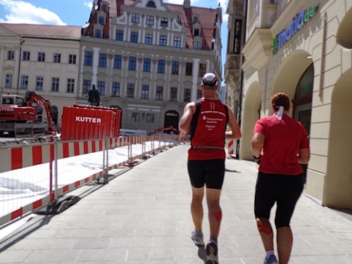 Beim Start des AOK-5km-Laufs werde ich von Marion vom Team Bittel eingeholt, ihre Begleiterinnen machen ein Foto von uns. Unter der Regierung von Schwaben durch, am Dom vorbei, treffe ich kurz darauf auf Gert. Seine Stimmung ist am Tiefpunkt, er sei bereits 3x zu Sturz gekommen. Dann verabschieden wir uns: „Alles Gute noch, wir sehen uns im Ziel!“ Als ich diesmal am Rathaus und den Gästen des Cafés vorbei komme, nehme ich die linke Spur und spende damit 3,- EURO. Hinterm Fugger-Denkmal gibt es wieder Treibstoff! Die Hitze der Stadt ist im Sommer brutal – wusste schon Rainhard Fendrich Anfang der 80er Jahre zu singen. 28°C - Vielleicht wäre die Vorverlegung des Starts auf 07h30 wie in Füssen eine Idee?