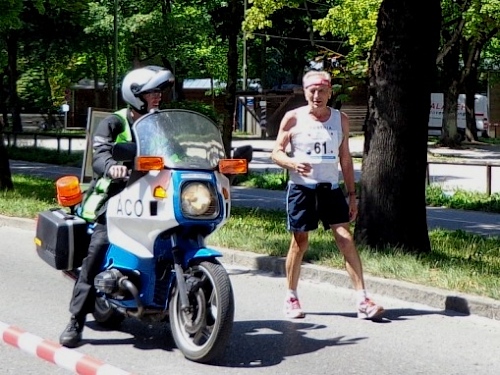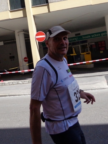 Km38 nach 4h04min; Auf der gegenüberliegenden Spur kommt Gerhard Wally daher, den hätte ich vor mir vermutet. Nach dem Stadttheater geht es an einer kleinen Bar vorbei. Ich werde eingeladen, nach dem Rennen auf einen Espresso vorbei zu kommen. Vielen Dank, das muss ich mir noch überlegen, vorher muss ich jedenfalls duschen!