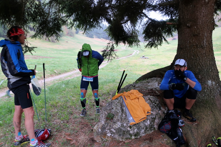 Zunehmend nähern wir uns den Hochlagen des Monte Carone (1621 m). Und siehe da: Die Steigung flacht ab, das Schritttempo zieht an - leider auch der Regen. Zwei ausladende Bäume auf einer Wiese werden zum Umziehrefugium für die Läufer. Wer es bis jetzt noch nicht gemacht hat, macht es jetzt: sich regenfest.