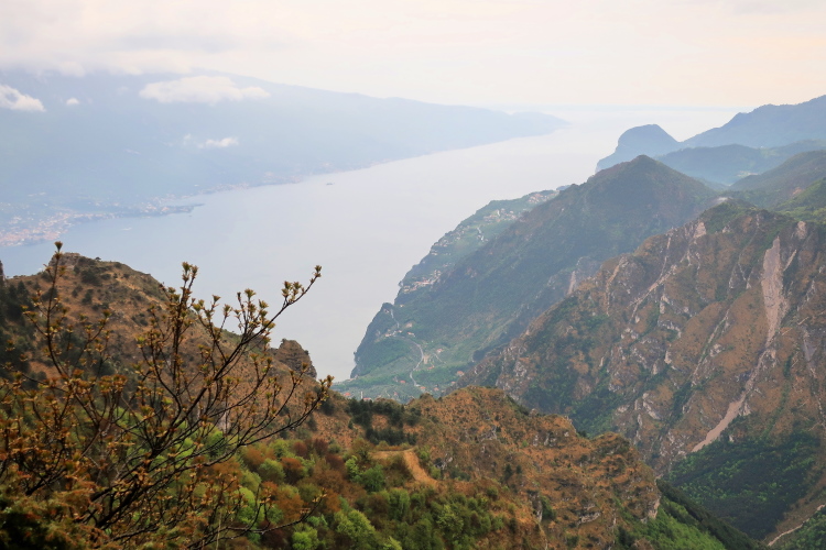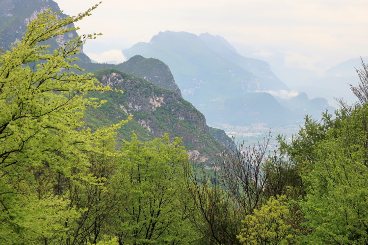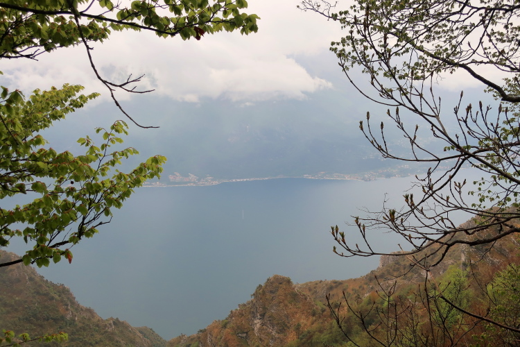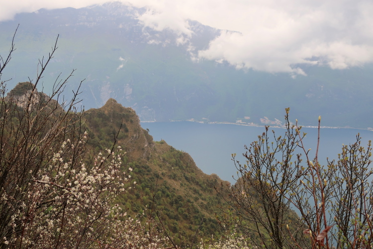 Zögerlich lichtet sich das milchige Einerlei. Um mich herum durchbricht schroffer Fels das Grün, am Horizont zeichnen sich die Konturen von Bergen aus dem Himmelsgrau ab. Und tief unter mir wird langsam eine große Freifläche erkennbar. Oder ist das eine tiefliegende Wolkenbank? Es dauert schon ein paar Momente, bis ich kapiere: Das, was ich da nur schemenhaft sehe, ist der Gardasee. 1.200 Meter tiefer.