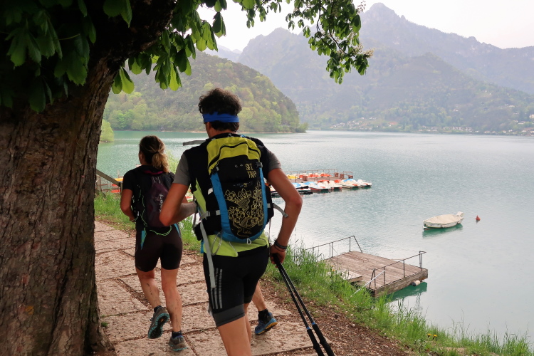 Der Vorteil einer solchen Streckenführung: Wir verlieren relativ schnell an Höhe. Und so wird der Höhenblick immer mehr zum Seitenblick. Bei Molina di Ledro treffen wir nach 20 km an dessen Südostseite auf den See. In einem Freiluftmuseum werden hier die aufgepeppten Überreste einer Pfahlbausiedlung aus der Bronzezeit präsentiert. Vorbei am Museum folgen wir ein kurzes Stück dem Uferweg und freuen uns zur Halbzeit auf die zweite Verpflegung.