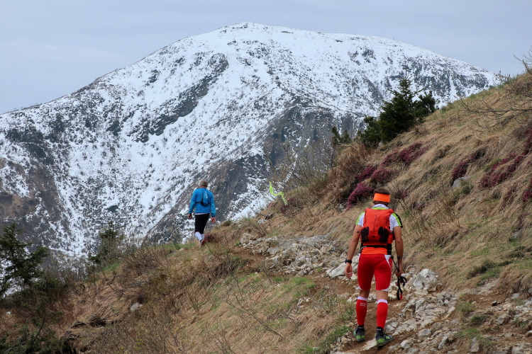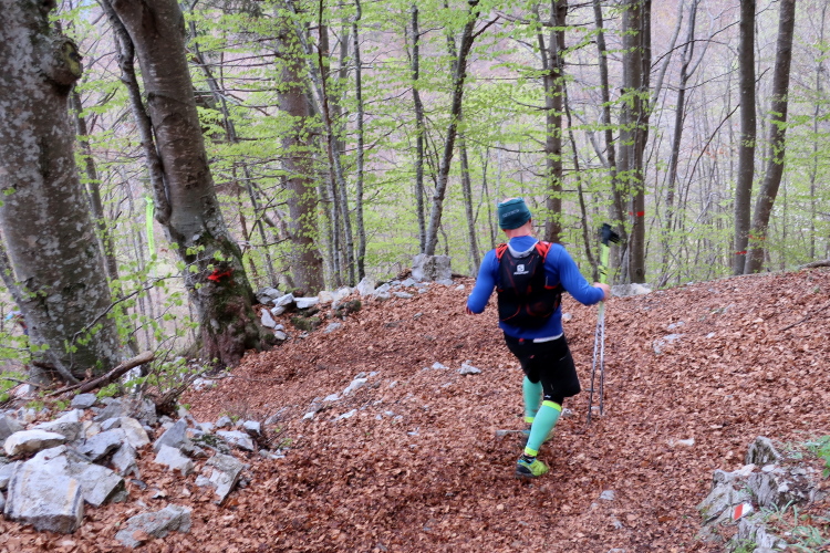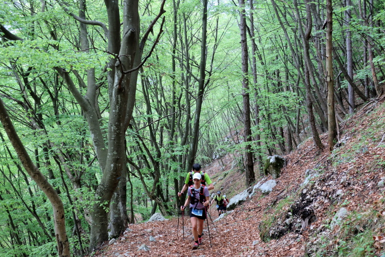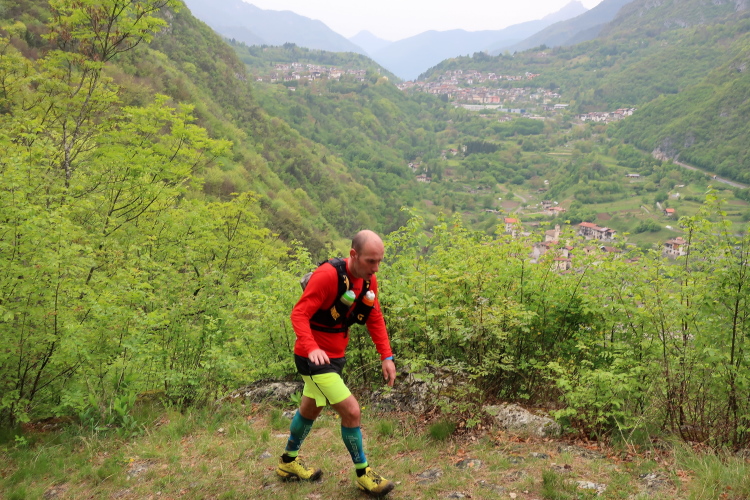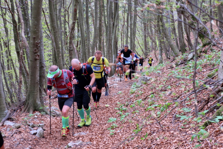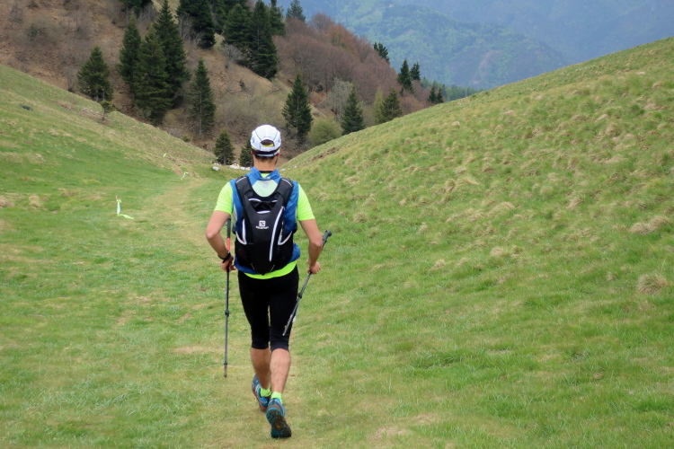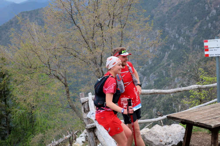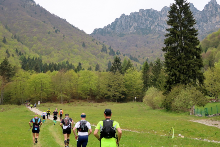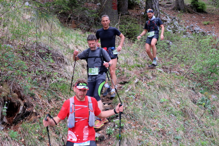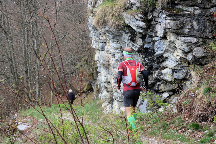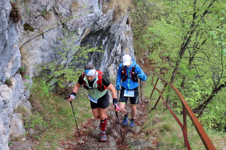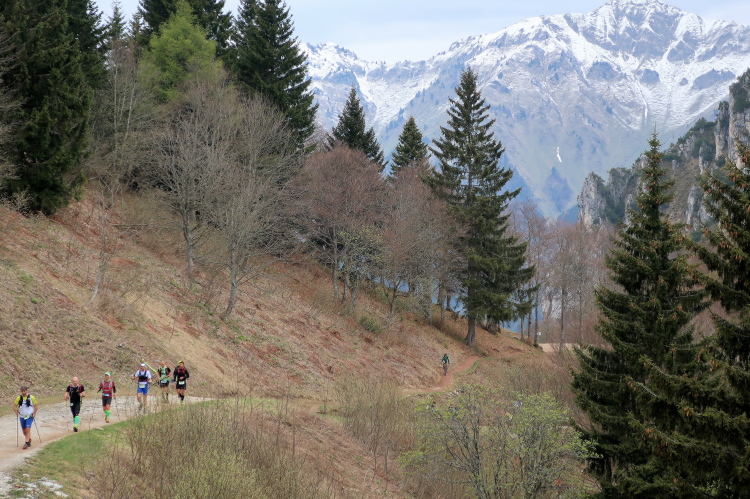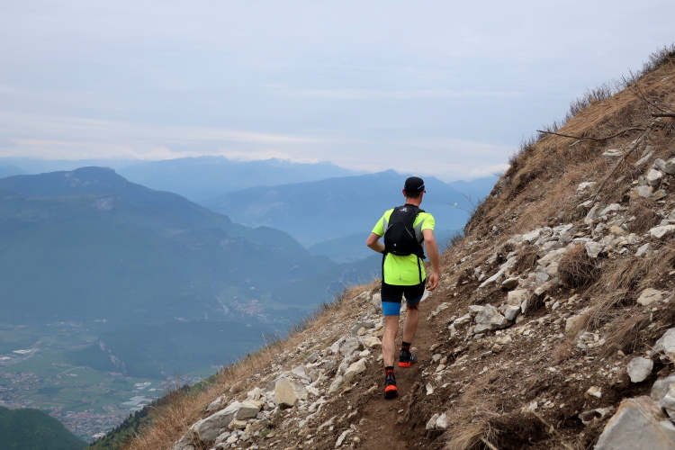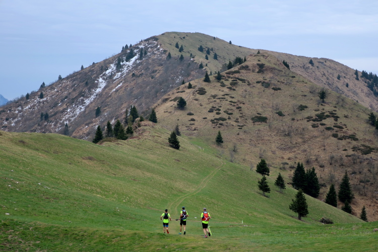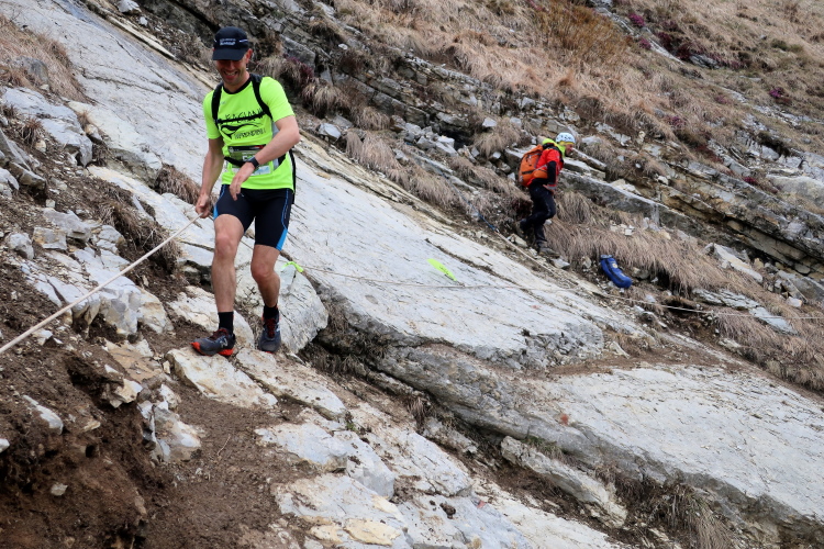 Der wahre läuferische Lohn der vorangegangen Mühen folgt aber erst jetzt. Die folgenden Kilometer auf einem Höhenweg zwischen Bocca Saval (1.721 m üNN) und Bocca Dromaè (1.685 m üNN) sind ein trailläuferischer Traum. Wundervoll ist der schier grenzenlose Panoramblick auf die Alpengipfel im Süden. Der ausgesetzte Single Trail führt in stetigem Auf und Ab durch die Bergflanken der bis knapp unter 2.000 Meter reichenden Cima Pari und Cima Sciapa. Ausgesetzt heißt: Felsig, schlammig, schneeig - alles ist geboten. Konzentration ist also oberstes Gebot. Aber es macht gewaltig Spaß, einer Gämse gleich durch die offene Bergwelt zu hoppeln. An zwei Stellen sind Stahlseile zur Sicherung angebracht und auch die Bergwacht hat ein Auge darauf, dass nicht eine der „Gämsen“ sich vor lauter Übermut überschätzt.