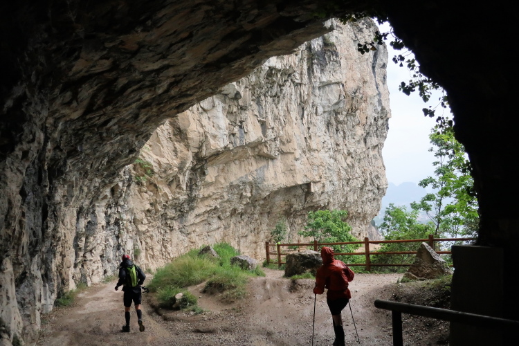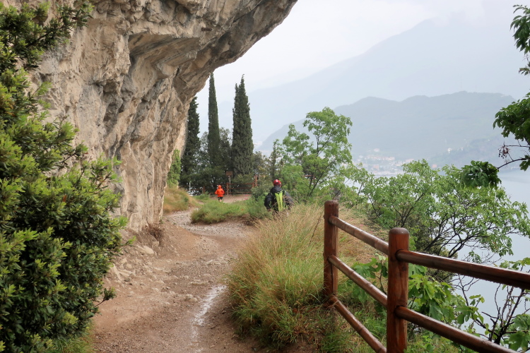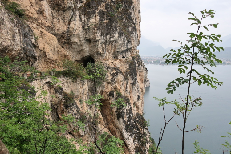 Um eine Kurve herum geht es gleich weiter auf den tief in den senkrechten Felshang eingeschnittenen, teils durch Tunnel verlaufenden Sentiere. Spektakulär ist der Eindruck, den dieser gut 2 km lange Weg in Kombination mit der Steilküste und dem See vermittelt. Die Emotion, was den See angeht, hält sich heute in Grenzen, vor allem, wenn man die Ponalestraße schon bei Sonnenschein erlebt hat. Zumindest der Weg selbst ist auch bei diesem „Schietwetter“ ein besonderes Erlebnis. Steinerne Mäuerchen, Holzbalustraden oder auch nur die Natur sichern vor einem garantiert lebensauslöschenden Sturz in die Tiefe. Überhaupt die Natur: Faszinierend ist allein schon zu beobachten, wo und wie die Natur sich ihren Lebensraum inmitten des nackten Felses sucht und schafft.