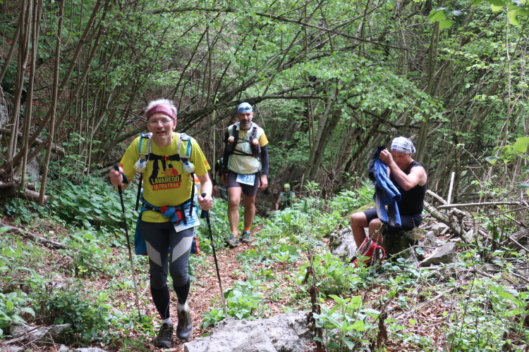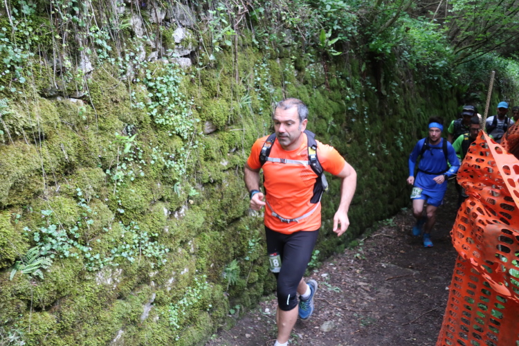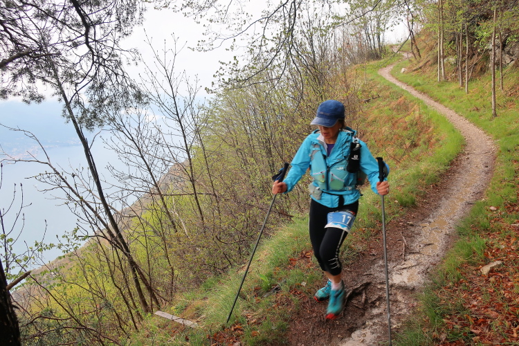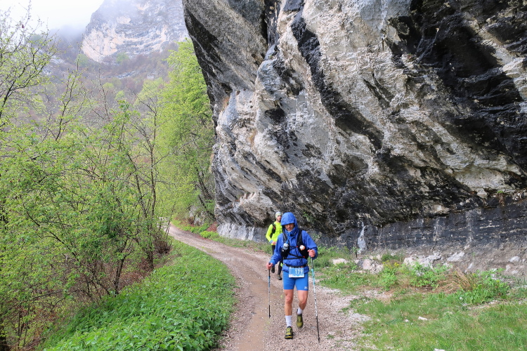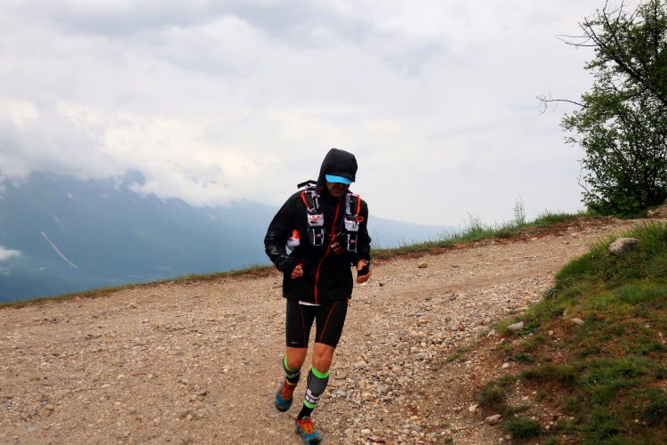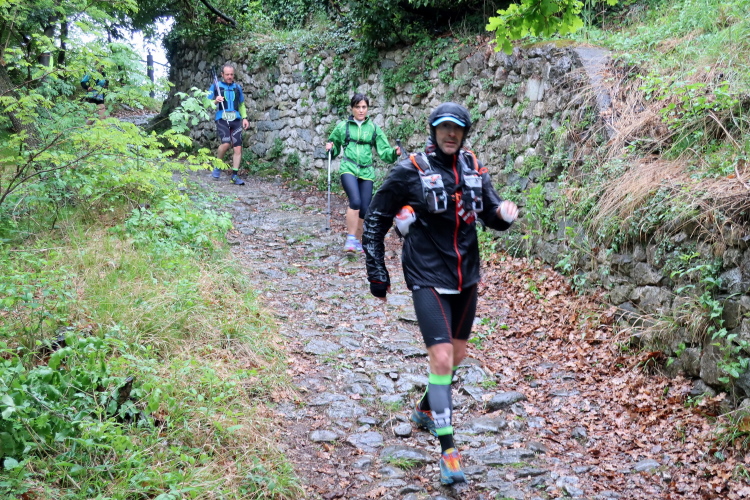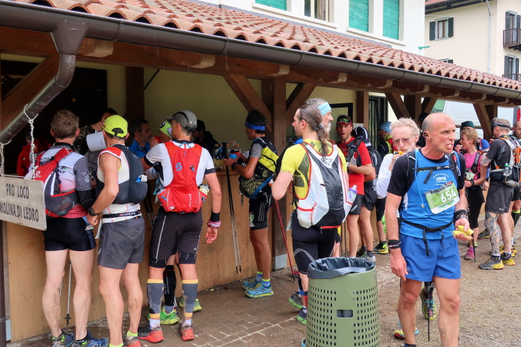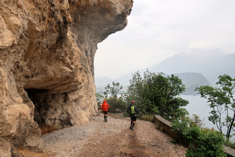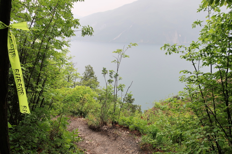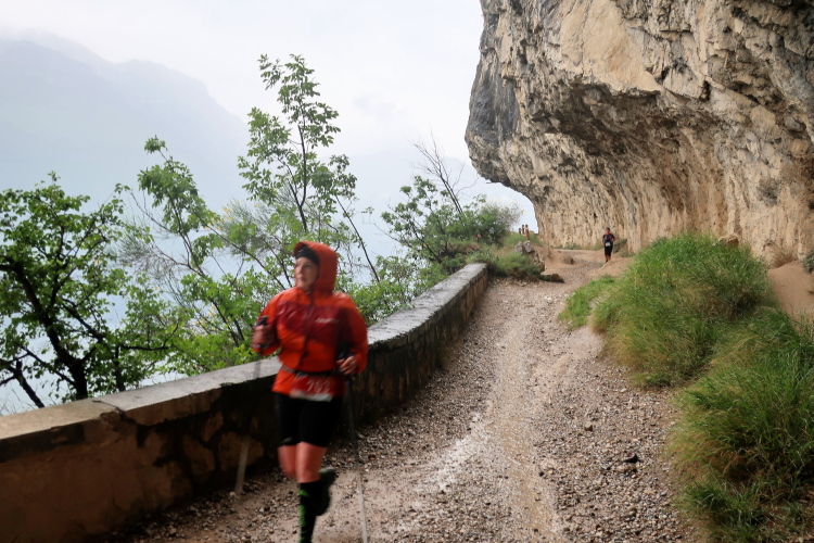Zu den 60 und 42 km-Läufern gesellen sich ab hier die Starter des Ledro Trail Experience, die um 13:30 Uhr in Bezzecca bei Pieve di Ledro am gegenüberliegenden Seeufer gestartet, aber zum überwiegenden Teil schon auf und davon sind. Und leider stellt sich auch ein weiterer ungebetener, wenn auch angekündigter Gast ein: Der Regen.