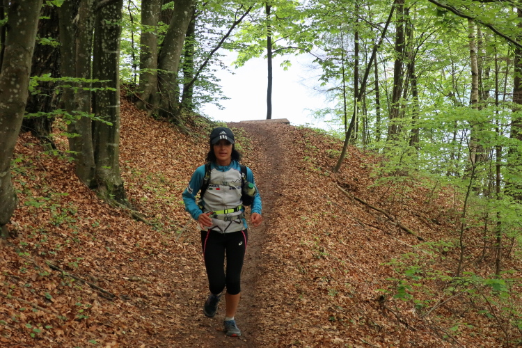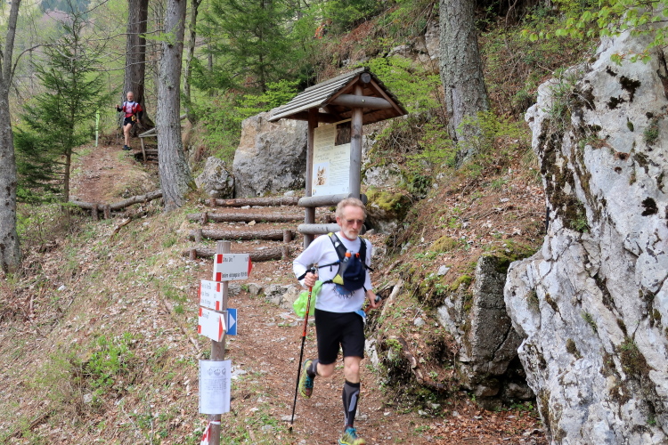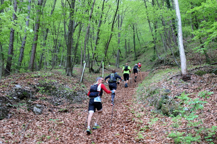 Aber es ist ein Anstieg in Etappen. Durch dschungelartiges, frühlingshaft saftiges Grün führt der Pfad den Hang hinauf. Meist wurzelig und steinig ist der Untergrund, vielfach noch vom trockenen Laub des letzten Herbstes etwas heimtückisch überdeckt. Aber beim Aufwärtswalken droht da ohnehin wenig Gefahr. Gerade noch am Anfang eingestreut sind kleinere Passagen auf Asphalt, vorbei an Weinbergen und durch Wiesen.