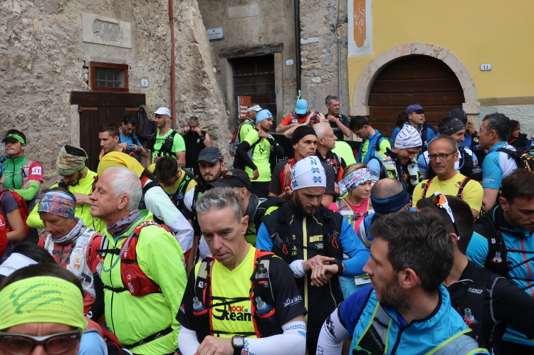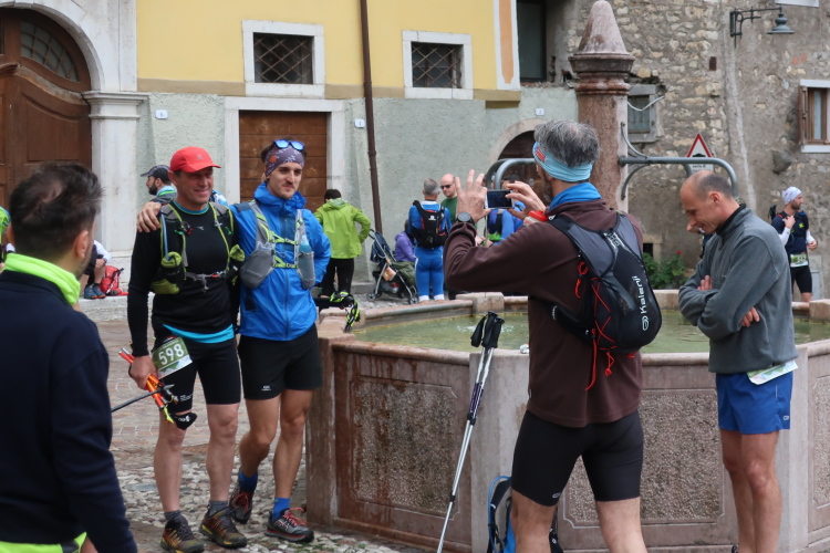 Unterhalb des Startplatzes, der Piazza Cesare Battisti im Herzen der Altstadt, endet die Busfahrt. Unterhaltsam ist das Warten auf der Piazza mit herrlichem Blick auf die grünen Berghänge rundum auch deshalb, weil direkt hier die 60 km-Läufer vorbeilaufen. Von Arco aus startend sind sie bereits seit 8 Uhr unterwegs. Mit großem Hallo werden sie empfangen. Nach einem finalen Briefing mit der eher unerfreulichen, aber bestimmen Ankündigung „Es wird regnen“ ist es dann auch bei uns so weit. 11 Uhr ist es, als es heißt: Trailer Marsch!