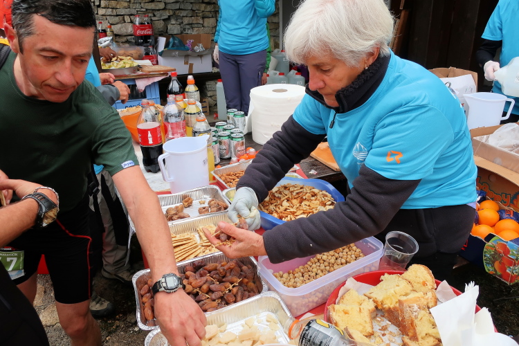 In diesem Moment mindestens genauso herrlich: Vor dem exponiert zu Füßen der schroffen Klippen der Mazza di Pichea liegenden Schutzhaus ist ein üppiges Verpflegungsbuffet aufgebaut. Nur drei davon gibt es entlang des Kurses, aber dafür ist das, was geboten wird, vom Feinsten. Ein Auszug gefällt? Italienischer Rohschinken („Crudo“) und Salami zu Grana-Käse, dazu Weißbrot, Datteln, Nüsse, Kekse, Kuchen und vielerlei Obst. Tee und Cola, selbst Bier gibt es. Kein Wunder, dass sich die Läufertraube um den reich gedeckten Tisch drängt.