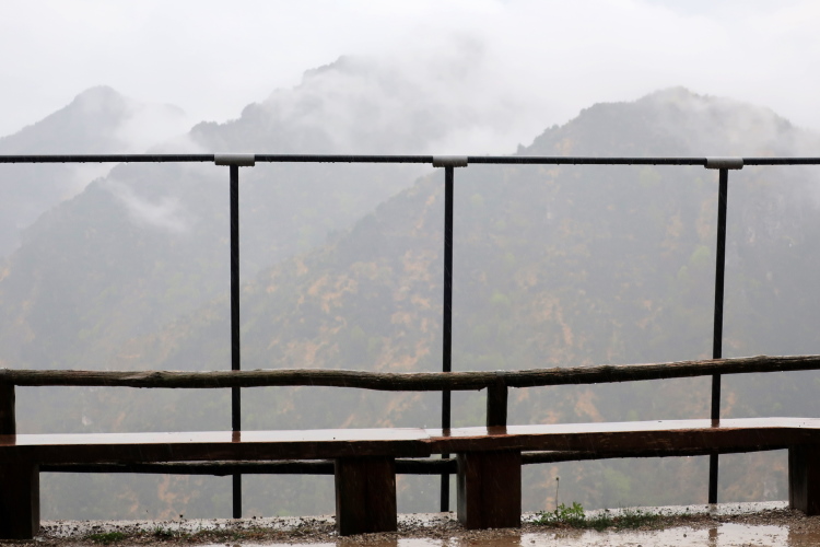 Bei 1.254 m üNN liegt unser höchster Streckenpunkt auf diesem Teilstück. Wann und wo das ist, merke ich aber nicht bzw. allenfalls daran, dass wir auf einmal in den Wolken sind. Nur zögerlich lösen sich die Schwaden, aber zu sehen gibt es dennoch nichts. Relativ flach geht es auf dem Weg dahin. Dass ich mich auf einem Höhenweg befinde, merke ich aber nur und erst, als ich eine Schutzhütte sowie am Wegesrand eine Brüstung und davor Bänke entdecke. Was es hier wohl zu sehen gibt?