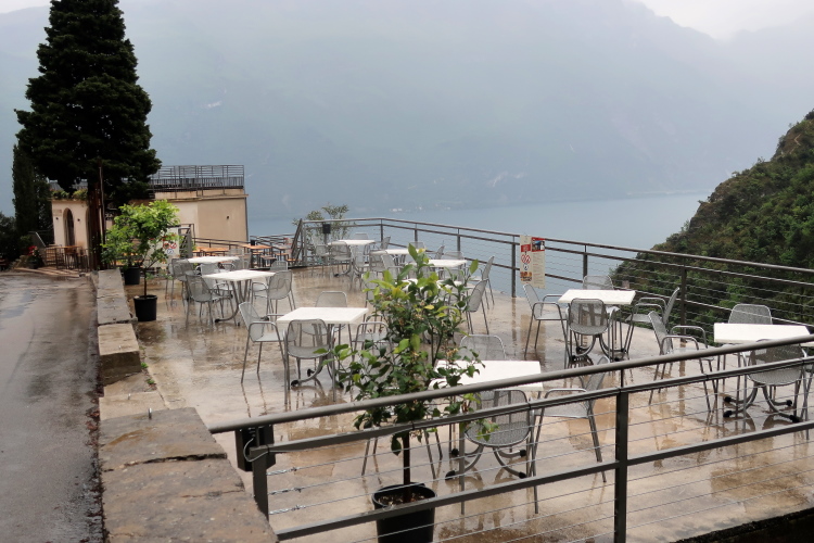 Gleich zu Beginn passieren wir die alte Raststation Ponale Alto Belvedere, die im Juni 2014 zu ihrem 100-jährigen Bestehen wiedereröffnet wurde. Auf mehreren Ebenen sind Holzterrassen angelegt, auf denen man bei einem Drink und Traumkulisse wundervoll „abhängen“ kann. Heute hängt bei diesem Wetter niemand ab. Und die die Bar hat ohnedies zu.