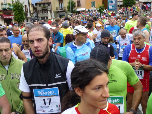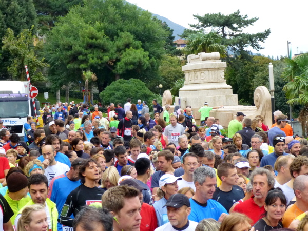 Der Uhrzeiger rückt auf 9:30. Die 15 km-Läufer, die von Malcesine aus auf direktem Weg Torbole ansteuern, werden in den Startbereich gerufen. Kaum sind sie mit großem Getöse verabschiedet, darf auch der Haupttross nachrücken: Marathonis und 30 km-Läufer. Sie teilen sich auf dem Laufkurs alles. Bis auf die letzten 12 km. Die Spannung steigt und es passiert … nichts. Aber da die dauerparlierende Startmoderatorin ihre gute Laune nicht verliert, denke ich mir nichts dabei. Verstehen kann ich ohnehin nichts. Dann bekommt sie auf einmal ein Handzeichen. Tutto a posto. Und schon ertönt der Countdown. Los geht’s.