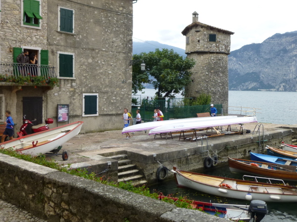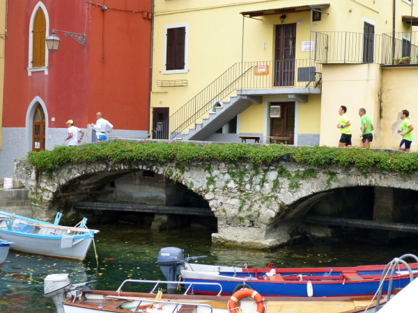 Es sind herrliche Kilometer, ja mehr noch: ein läuferischer Traum. Von der Straße aus war dieser Weg gar nicht zu sehen. Er führt uns, mal auf Platten, mal auf Asphalt, dann wieder auf Kies oder auch Sand und ab und an über ein Brücklein direkt am Seeufer entlang, jede Biegung und jeden Winkel der Uferlinie mitnehmend. Und hinter jeder Windung eröffnen sich neue wundervolle Perspektiven auf Ufer, See und Berge. Stets haben wir das Rauschen der Wellen im Ohr. Auch die Orte, die wir auf dem Hinweg schon passiert haben, Porto, Assenza und Cassone, dürfen wir nun aus einem ganz anderen, sehr viel attraktiveren Blickwinkel erleben. Denn der Weg führt uns mitten durch die am Seeufer gelegenen historischen Dorfkerne hindurch. Ein Highlight ist jedes Mal der kleine Rundlauf auf holprigem Pflaster um die pittoresken alten Hafenbecken herum.