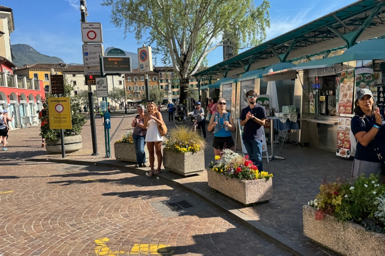 Links ein Wasserkraftwerk aus dem Jahr 1928. Es ist ein Pumpspeicherkraftwerk, das nur im Winter genutzt wird, um das Niveau des Ledrosees im Sommer für die Feriengäste konstant zu halten. Dann unter dem Beifall vieler Urlauber in die Altstadt. Das macht viel Spaß. In der Birreria sitzt man schon beim Frühschoppen und allgegenwärtig ist natürlich der 10-Uhr-Aperol Spritz.