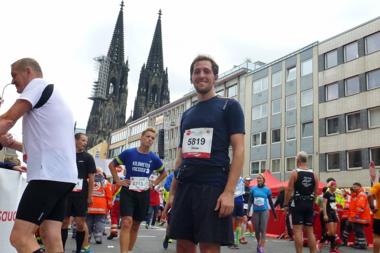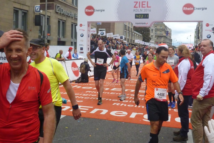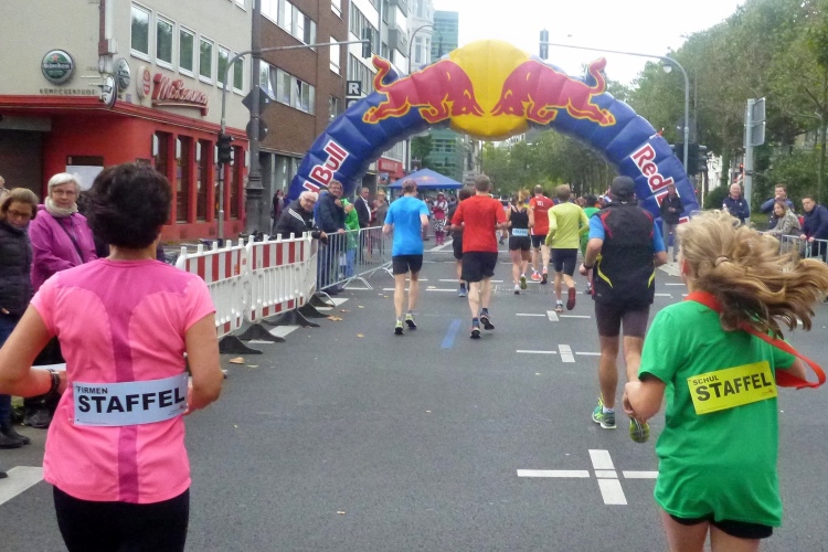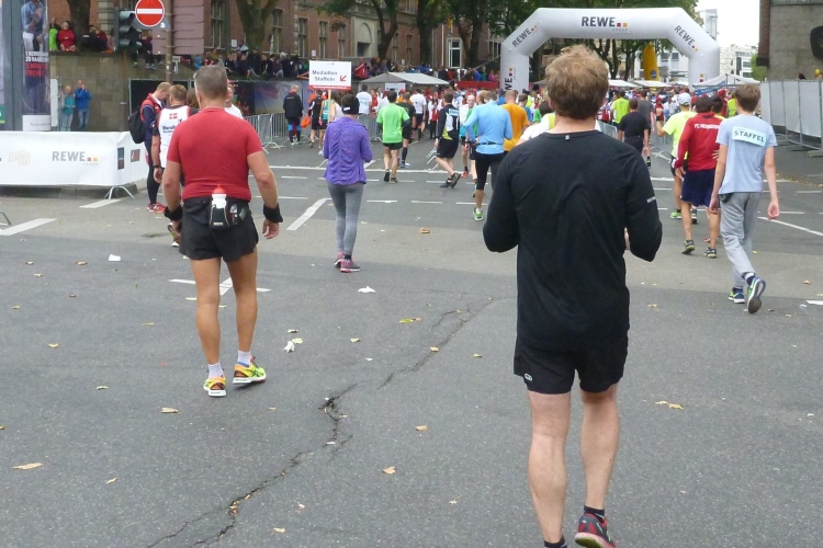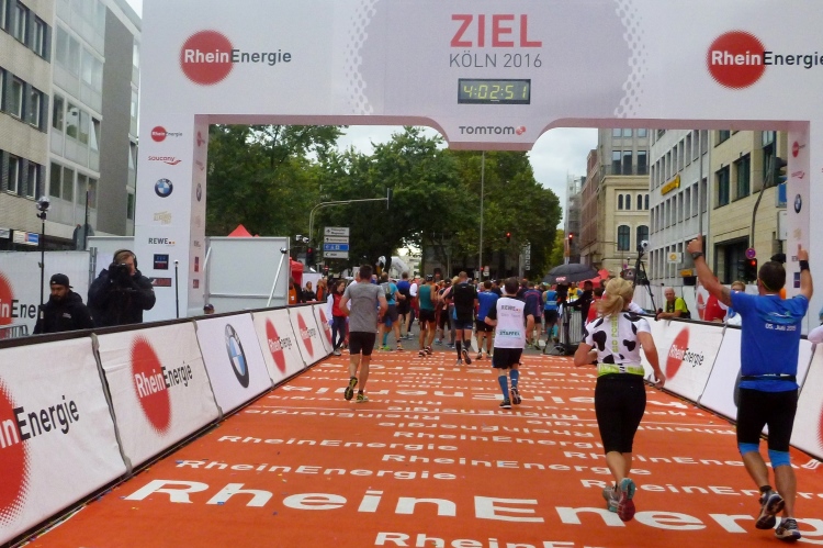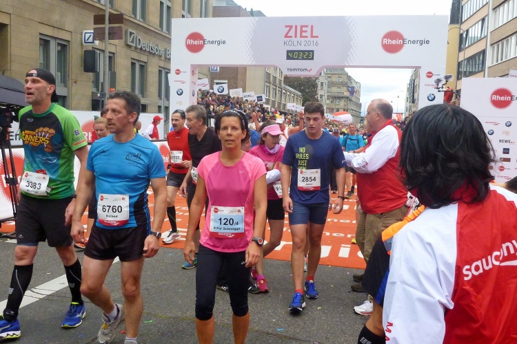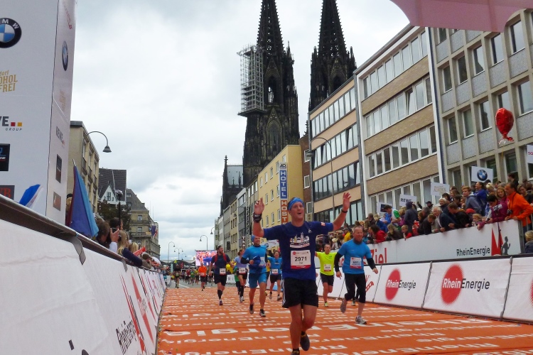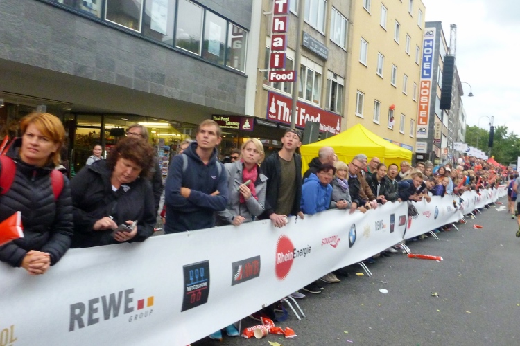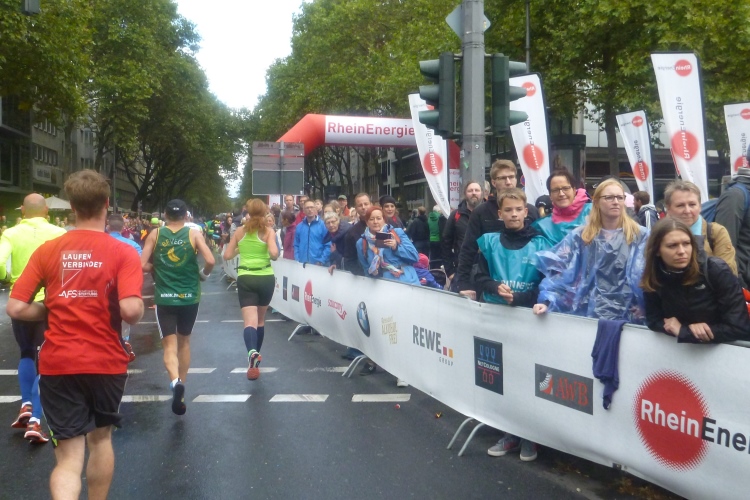 Jemand ruft meinen Namen: Wolfgang vom M4Y-Team steht an der Strecke, wir sehen uns nächste Woche in München, von wo er auch den Marathon-Bericht liefern wird. Endlich die Hohe Straße mit ihren am heutigen Sonntag geschlossenen Geschäften. Kurz vor dem Dom halten wir uns leicht links. Kurzer Blick auf das riesige Gebäude. In die Komödienstraße – haha - die Kirche meines Namenspatrons St. Andreas! Dann Zuschauertribünen, roter Teppich des Hauptsponsors Rheinenergie. Einige Marathonis ziehen vorbei. Ich genieße die Stimmung und dann „Rhein ins Ziel“, wozu uns Spruchbänder animieren und was wir uns natürlich nicht zweimal sagen lassen.