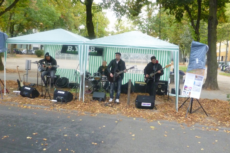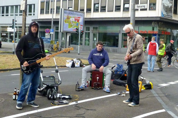 Es geht durch den Grüngürtel nach Sülz. Ich wünsche den Wartenden viel Spaß, bis der nächste Bus kommt. Der Platz vor der Universität ist zweimal zu unterqueren. Auf der Zwei-Kilometer-Schleife durch Sülz wird uns trotz beginnenden Nieselregens viel Zuspruch zuteil. Vor einem Café ein Alleinunterhalter mit vielen Senioren, die nicht so recht wissen, ob sie dem Sänger oder uns applaudieren sollen.