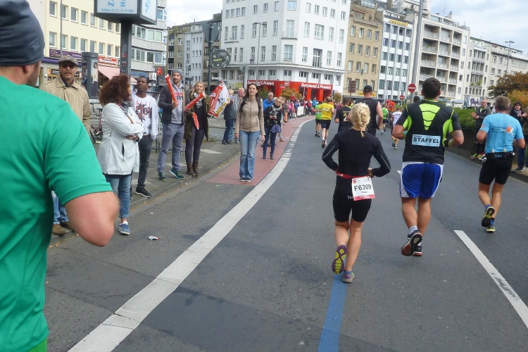 Wer hat denn jetzt diese blöde Brückenauffahrt in die Strecke eingebaut? Ein paar läppische Höhenmeter nur, aber eben bei km 36. Begegnungsstrecke. Es kommen immer noch Läufer hinter uns. Am Ebertplatz schwenken wir auf den Hansaring unter der Bahn durch. Vier Kilometer Party pur warten auf uns. Noch schnell zwei Cola, dann auch noch ein Red Bull. Wo ich gerade genau bin, weiß ich nicht so recht. Aber Spaß macht es. Ich treffe Schlachtenbummler Michel aus Frankreich, der uns auch in Berlin angefeuert hat.