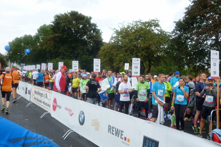 Vor der Bismarck-Kneipe ein Böllerschuss mit schwarz-rot-goldenem Konfettiregen. Für ein Foto bin wieder zu spät dran. A propos Schwarz-Rot-Gold: Tag der Deutschen Einheit ist erst morgen! Weit hinten der Fernsehturm, neben uns der Firmenstaffelwechsel Nummer zwei. Judith zieht an: 2:00 h für 22,2 km. So schnell? Das könnte noch ein sub 4 werden. B.Y.O.B. - bringyourownbeer heißt die erste Band, die Radio Köln für uns ausgesucht hat, hier am Fröbelplatz. Der Name scheint Programm zu sein, denn Bier gibt es keines an den elf Verpflegungsstellen von Rewe. Anfangs Wasser, dann Bananen und Iso, ab km 31 auch Cola. Dafür höre ich ein „Andreas, nimm noch en Stück Banane“. Da kümmert man sich um mich.