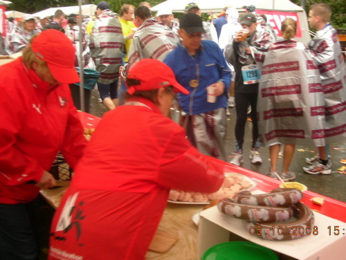 Einige Fotos schieße ich noch, dann begebe ich mich, dankbar in eine Wärmefolie gehüllt, im Zug der lebenden Leichen zur Medaillenübergabe und Zielverpflegung. Und was für eine Zielverpflegung! So etwas habe ich noch nicht erlebt. Der Sponsor REWE scheint die meisten seiner Regale für uns geleert zu haben. Das hat schon eine andere Qualität als bei anderen, noch größeren deutschen Stadtmarathons. Der Lebensretter aus Erding fehlt auch nicht und so ziehe ich zufrieden von dannen.