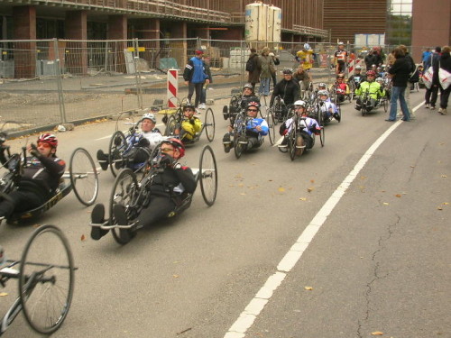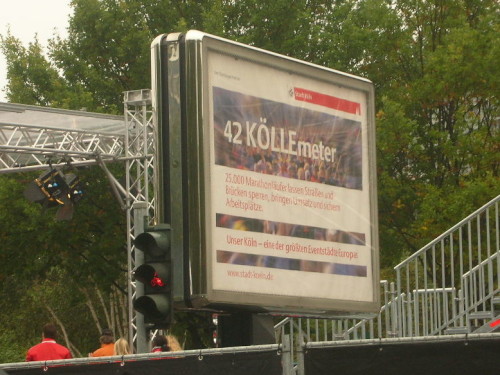 Erstmals markiert heuer eine auf den Asphalt gepinselte blaue Linie als Orientierungshilfe den kürzesten Weg ins Ziel. Das mag für die Elite diesem Zweck dienen. Ich hoffe, daß angesichts der im Rennverlauf immer wieder angebotenen Kölschstangen und der damit verbundenen Folgen für den einen oder anderen Läufer diese nicht zur polizeilichen Kontrolle der Lauftüchtigkeit mißbraucht werden wird!
