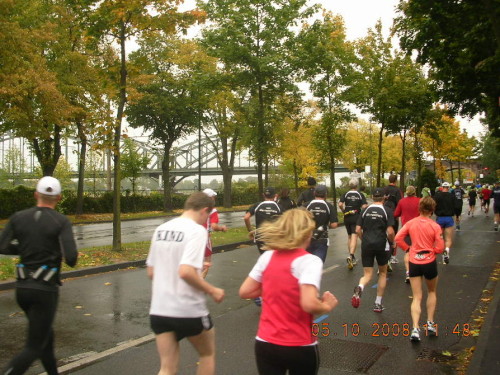 Wir streifen Ehrenfeld und die Neustadt und kommen auf eine 3 km lange Begegnungstrecke, wo ich endlich mal die Schnellen sehen kann, die hier schon 7 bis 8 km Vorsprung haben. Die unvermeidliche Biggi Lennartz, die 9. Frau werden wird und mit mir in Polch war (da hat sie gewonnen), grüße ich lautstark quer über die Bahnlinie, welche die beiden Straßenseiten trennt.