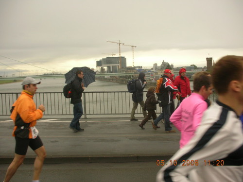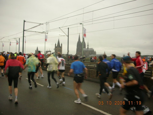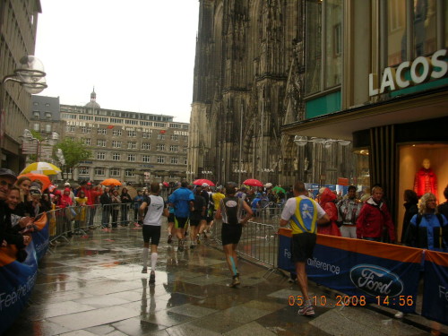 Die Domplatte ist wie üblich ätzend windig und heute auch gefährlich rutschig. Aber das wird gemeistert und schon sehe ich die Deutzer Brücke vor mir. Hier kann ich noch einmal meine Bergqualitäten ausspielen und laufe erschöpft, aber glücklich an nicht voll besetzten (!) Zuschauertribünen vorbei, ins Ziel.