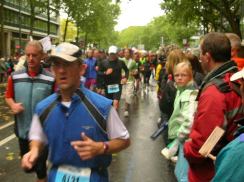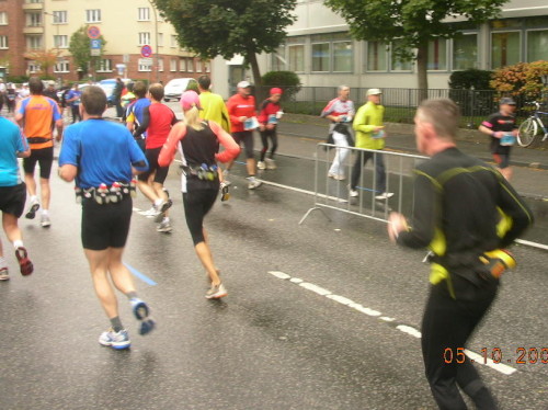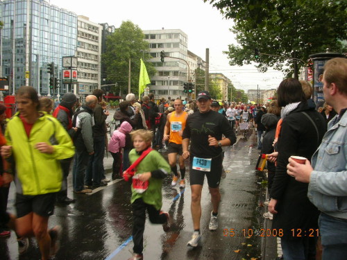 Bei km 17 fängt es wieder zu regnen an. Es gibt zwar jetzt auch Bananen und Cola, aber das reißt die Laune nicht wirklich nach oben. Meine Kamera meldet Stromnot, ich schalte den Blitz aus und so hält sie bis zum Ende, wenn auch bedenklich feucht, durch. Über Friesen- und Fröbelplatz nehmen wir die Halbmarathon-Marke. Knapp 1:54 Std. ist ok. Ich merke aber, daß es mir heute schwerer als sonst fällt. Vielleicht hätte ich doch besser auf den schnellen 10er am letzten Sonntag in Polch verzichtet. Aber was soll’s, man lebt nur einmal und man soll die Feste feiern, wie sie fallen. Den Pumuckl sehe ich vor mir, er läuft barfuß! Bei dem Wetter. Und der unverschämte Kerl ist auch noch so schnell, daß ich meine Vorhaben, ihn zu überholen und abzulichten, schnell aufgebe.