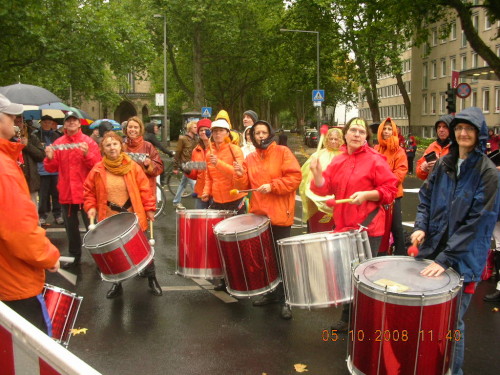 Die erste von mehreren Samba-Gruppen trommelt sich warm und verbreitet gute Stimmung. Nr. 1 der 11 Verpflegungsstellen steht kurz vor dem Chlodwigplatz, wo km 5 erreicht wird und bietet Wasser und Tee. Das Angebot wird sich mit zunehmender Distanz noch deutlich verbessern. Ein paar „Strafgefangene“ laufen mit mir am Rheinufer entlang, an der Südbrücke vorbei und bis zur Bismarcksäule. Hier verlassen wir Vater Rhein wieder und erreichen über den Bayenthalgürtel wieder Richtung Norden die Bonner- und Marktstraße sowie die Vorgebirgsstraße und, knapp vor km 12, den Barbarossaplatz. Bei km 7 hat es zu regnen aufgehört und alle hoffen, daß es jetzt trocken bleiben möge.