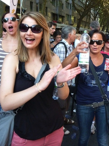 Wieder der Friesenplatz. Es ist eine ganz andere Stimmung als in Berlin, viel lockerer, weniger Halbleichen, viele lachende Gesichter, keine Erschöpfung. Und dann die Comboband in den m4y-Farben. Ich lege ne lockere Tanzpause ein, für die Leser wird das ein Suchbild in mitten der Orangen, hahahah.