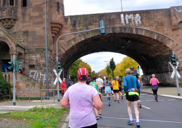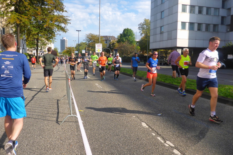 Auf der Gegenfahrbahn, durch einen schmalen Grüngürtel getrennt, kommen uns viele Läufer entgegen. Die gelben Startnummern sagen mir, dass sie nicht sehr weit voraus sind. Es geht ein Stückchen bergab, unter der U-Bahn hindurch und auf der anderen Seite wieder hinauf. Heute läuft es bei mir prächtig, wer weiß, wie lange noch!