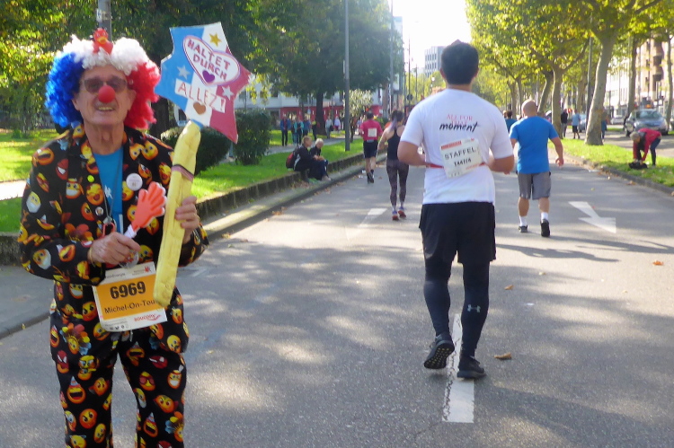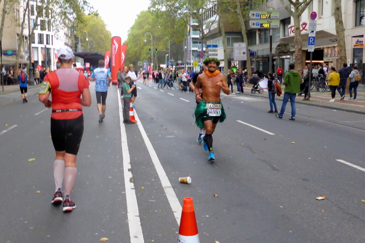 Musik ist zu hören, ein Moderator begrüßt die Läufer namentlich. Gleich gibt es auch eine Verpflegungszone. Im Stadtteil Sülz (km 18) lassen es sich die Bewohner nicht nehmen, die Marathonies gebührend anzufeuern. Percussions werden geschlagen, was das Zeug hält.