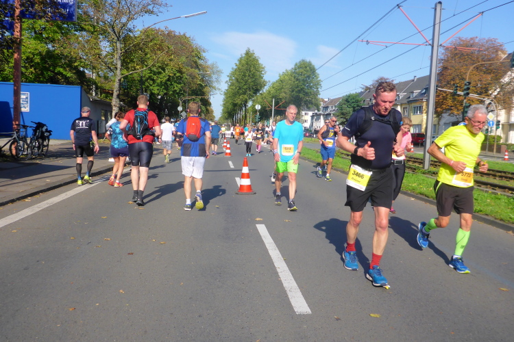 Aber für die Fans ist das Wetter sicher optimal und ein wenig auch für mich, denn nicht nur einmal werde ich auf ein gut gekühltes Kölsch eingeladen. Weil ich mich richtig gut fühle, kann ich die laute und überschwängliche Stimmung ausgiebig genießen. Bei km 35 bin ich zurück auf der Xantener Straße und dem Begegnungstück. Bis km 36 kommen mir noch recht viele Läufer entgegen, dann folgt noch der Besenbus – und Schluss.