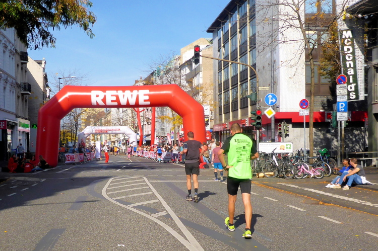 Links in der Dürener Straße ist das Marathontor schon weithin sichtbar. Da ist ganz schön was los. Toll, in so ein Stimmungsnest hineinzulaufen. Auch die Helfer an der VP brauchen sich über mangelnde Arbeit nicht zu beklagen. Ein zweites Marathontor und eine Gruppe Trommler machen uns noch mehr Beine. Es wird eng, das Publikum rückt näher heran. Dafür wird es auf der breiten Aachener Straße dann ruhig. Obwohl – da gibt‘s vor einem Haus viel Publikum und klasse Musik – und das live! Als nächstes steht ein junger Mann auf der Straße, spricht jeden mit Namen an und klatscht ab. Etwas weiter müht sich ein Trommler-Trio ab und zu guter Letzt kommt dann noch ein Spendentor bei km 23, wo sich Jugendliche für eine Spende gleich bedanken. Wer hier durch läuft spendet 3 Euro für die Kölner Organisation „Wir für Köln“.