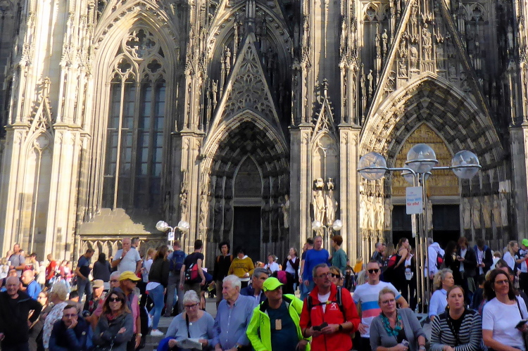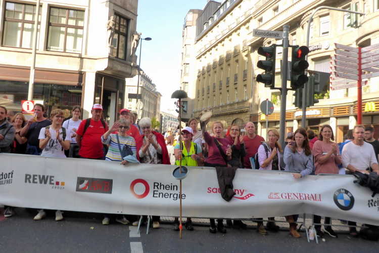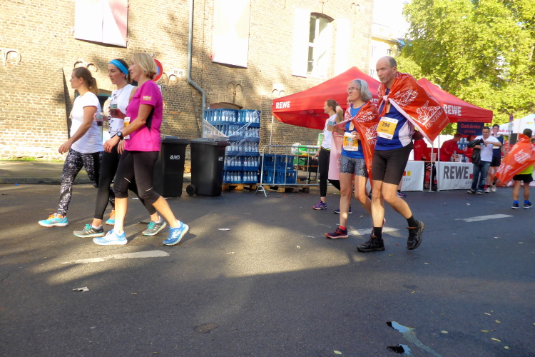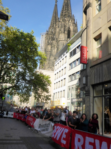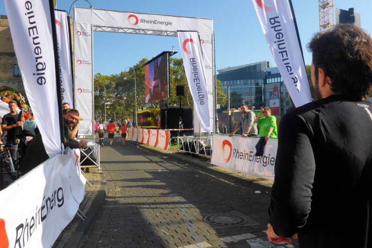 Der nächste Morgen dagegen beginnt gemütlich. Nach einem guten Frühstück beschließen wir, um einem eventuellen Ansturm auf die öffentlichen Verkehrsmittel zu umgehen, zu Fuß zum Start zu gehen. An der Hohenzollernbrücke erwartet uns ein besonderes Schauspiel: auf dem Gehweg kommen uns hunderte Fußgänger entgegen. Bestimmt sind das die Fans der Halbmarathonies, die um 8.30 Uhr gestartet sind. Sie machen sich nun auf, um vielleicht an der Strecke oder zumindest im Ziel die Läufer zu beglückwünschen.