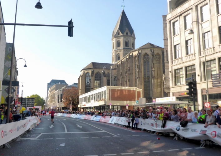 Die Hahnentorburg auf der anderen Seite des Platzes war einst Teil der rund acht Kilometer langen mittelalterlichen Wehrmauer und sicherte den westlichen Zugang zur Stadt. Im 13. Jahrhundert war dies die größte Stadtbefestigung nördlich der Alpen. Durch das Hahnentor zogen jahrhundertelang Kaiser und Könige des Reiches in die Stadt ein, um die Reliquien der Heiligen Drei Könige im Dom zu besuchen. Die Zuschauer klatschen und rufen uns mit Namen - und genauso geht es weiter. Gänsehaut. Der breite Hohenzollernring ist in der Mitte geteilt, hier kommen die Läufer entgegen, die kurz vor dem Zieleinlauf stehen. Oh je, da sehen welche ganz schön erschöpft aus. Wenn ich sie anfeuere, kommt dann aber doch ein Lächeln zurück.